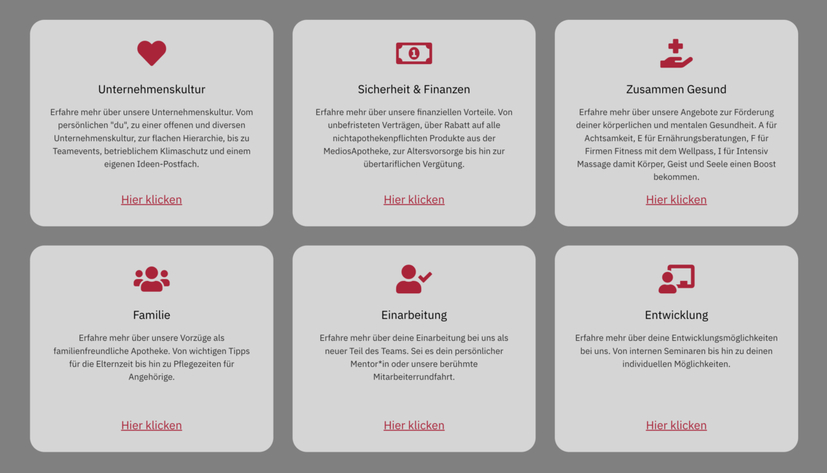 In Bezug auf Best Practices wurde auf Barrierefreiheit geachtet, sodass auch Nutzer mit Einschränkungen problemlos auf alle Inhalte zugreifen können. Der moderne Charakter der Seite unterstreicht das innovative Selbstverständnis der MediosApotheke und macht sie zum digitalen Vorbild ihrer Branche.
