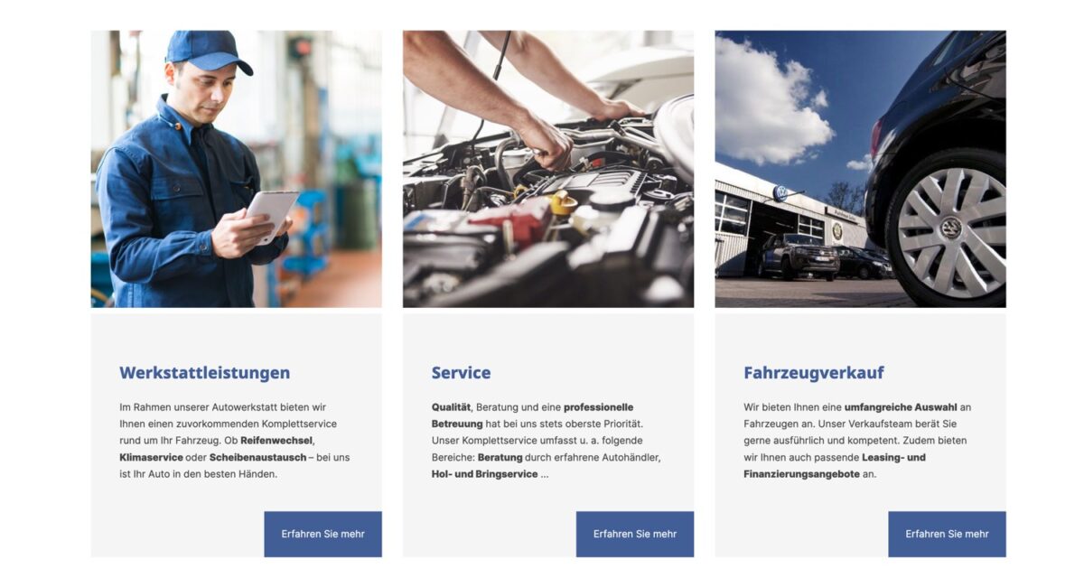 Die Navigation ist sauber strukturiert: Startseite, Fahrzeugverkauf, Service & Werkstatt, Team, Kontakt & Anfahrt sind gut erreichbar. Kontaktinformationen, Adresse, Öffnungszeiten etc. sind klar sichtbar. Das Autohaus kommuniziert eine ehrliche, lösungsorientierte Haltung was Authentizität und Vertrauen stärkt.