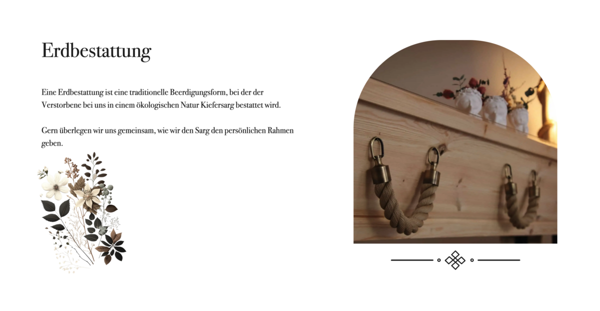 Ein besonderer Fokus liegt auf der inhaltlichen Ausrichtung: Nutzer finden umfassende Hilfestellungen und klare Aussagen zur Begleitung im Trauerfall. Die gut sichtbaren Kontaktmöglichkeiten sowie der direkte Call-to-Action unterstützen eine unkomplizierte Terminvereinbarung und Beratung. Auch technisch punktet die Website: Die Programmierung ist solide, SEO-strukturiert und erfüllt gängige Best Practices für Ladezeit und Responsivität, wodurch sie sich auf sämtlichen Endgeräten optimal präsentiert.