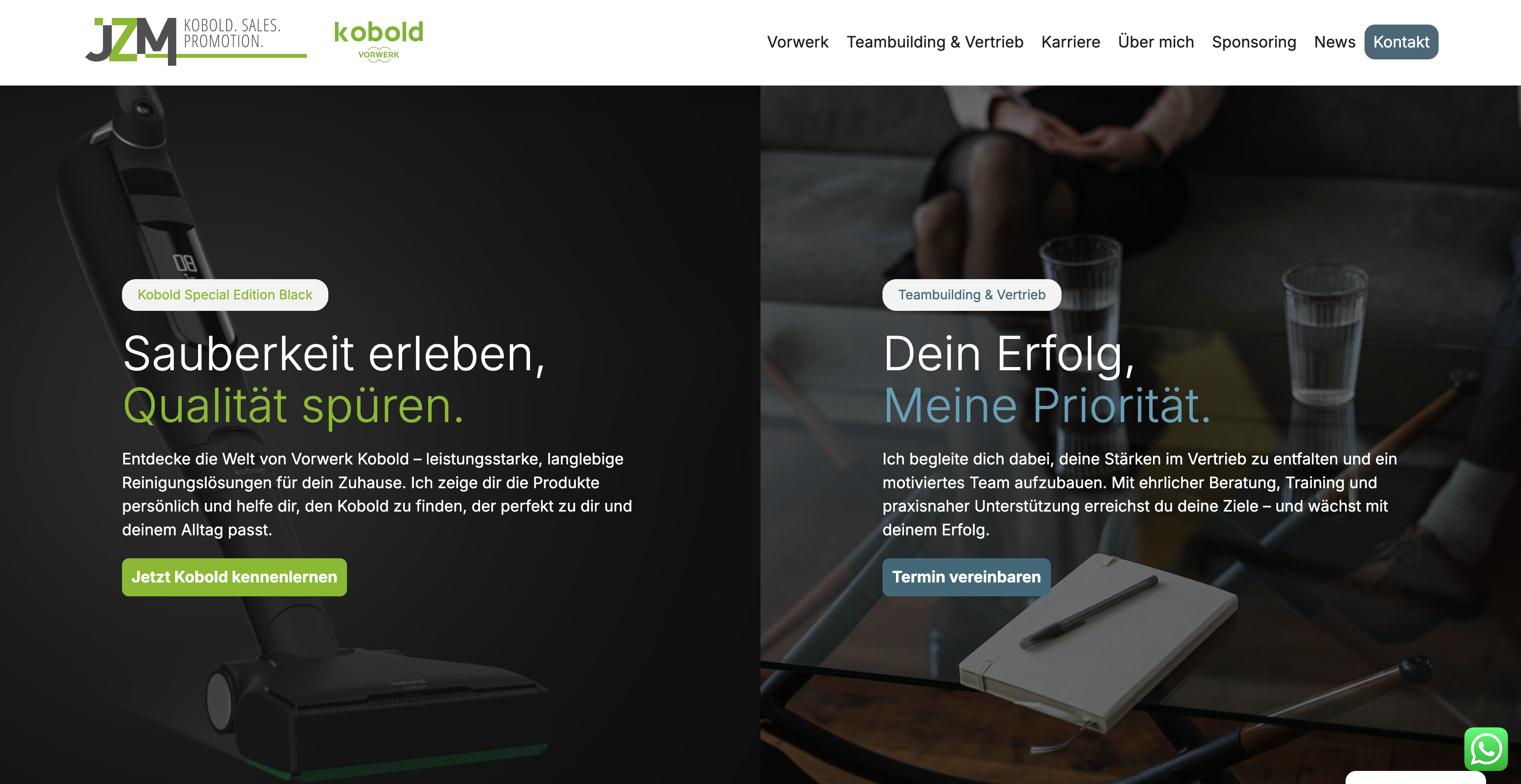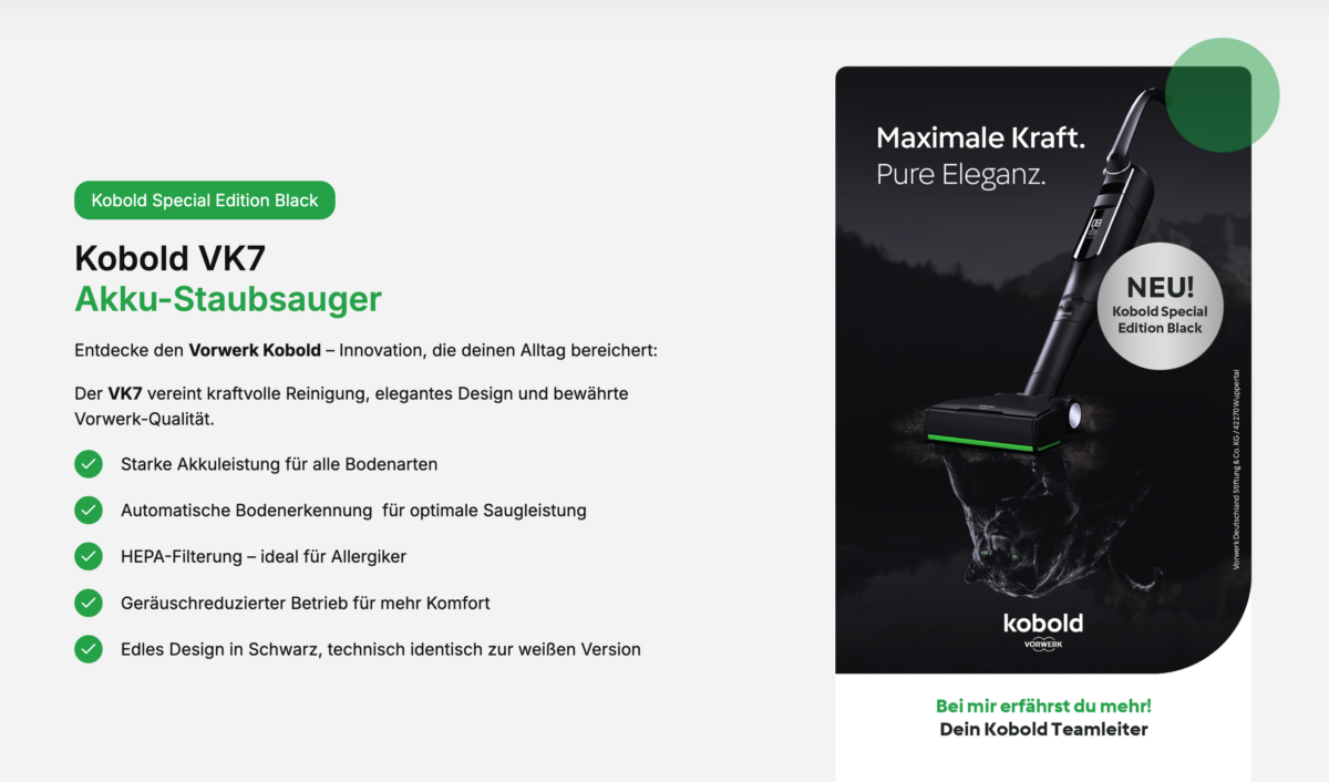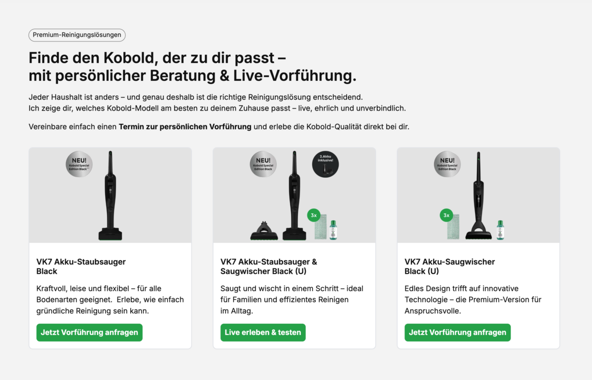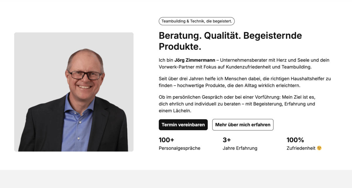 Die Website siegertypen.team überzeugt mit einem modernen, ansprechenden Layout und stellt damit ein starkes Beispiel für eine professionelle Online-Präsenz im Bereich Unternehmensberatung & Vertrieb dar. Die Startseite ist klar strukturiert, der Split-Screen-Einstieg vermittelt auf einen Blick die beiden Hauptschwerpunkte: Teambuilding & Vertrieb sowie hochwertige Produktberatung rund um Vorwerk Kobold.