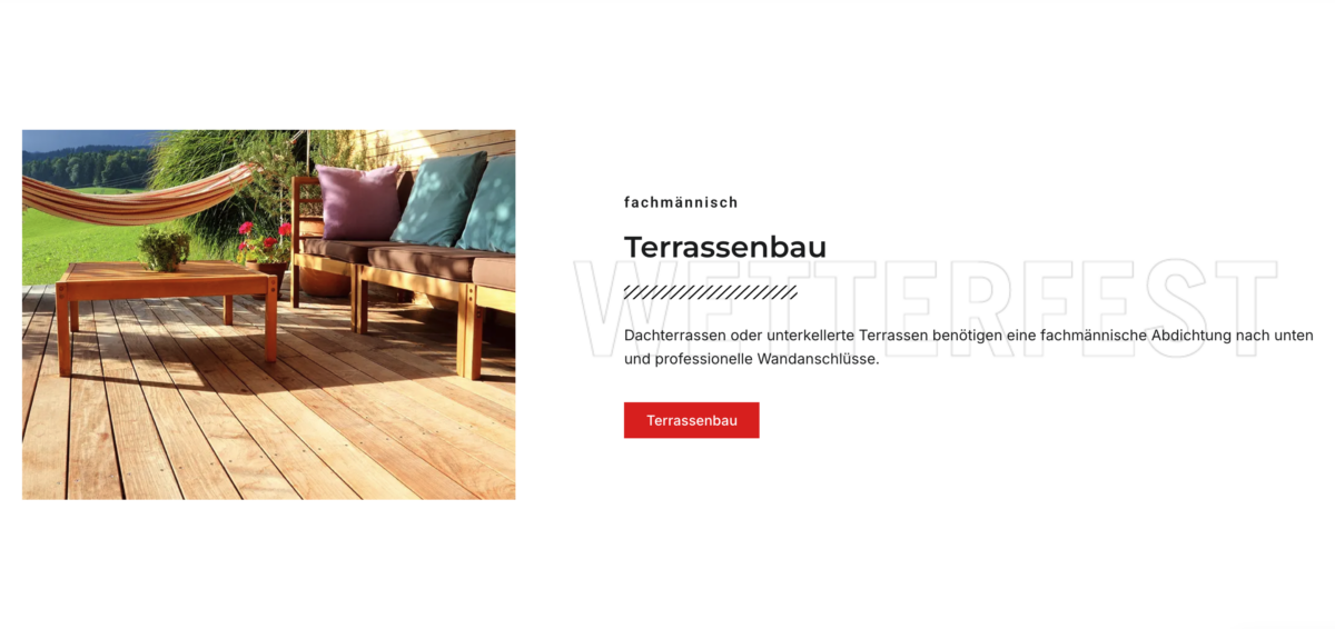 Besonders hervorzuheben ist das ansprechende Design: Klare Linien, harmonische Farbgebung und authentische Handwerksbilder schaffen eine professionelle und sympathische Atmosphäre. Die Startseite setzt auf große, hochwertige Fotos und aussagekräftige Siegel – hier werden Kompetenz und Erfahrung wirkungsvoll kommuniziert. Die Inhalte sind leicht verständlich, sowohl für Privat- als auch Geschäftskunden geeignet, und gezielt strukturiert. QR-Codes, eine durchdachte Kontaktintegration und schnell auffindbare Call-to-Actions erleichtern die Kontaktaufnahme. Diese Website überzeugt zudem durch eine sehr gute Lesbarkeit auf mobilen Endgeräten, kurze Ladezeiten und eine nutzerfreundliche Navigation.