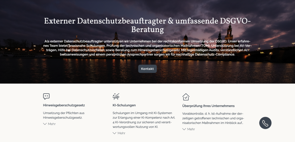 Im Quellcode überzeugt die Seite durch sauberes semantisches HTML – Überschriftenhierarchien sind logisch aufgebaut und unterstützen sowohl SEO als auch Barrierefreiheit. Interaktive Elemente wie Kontaktbuttons sind klar erkennbar, und der Blog liefert aktuelle Informationen, die Mehrwert für Bestands- und Neukunden schaffen. Auch SEO-relevante Aspekte wie Meta-Tags, Alt-Texte und eine schlanke Ladezeit werden erfüllt. Besonders positiv wirkt zudem der transparente Hinweis zur Verwendung von Cookies sowie die faire, persönliche Ansprache im Content. Diese Aspekte heben die Website positiv hervor und wirken sich direkt auf Nutzervertrauen und Sichtbarkeit aus.