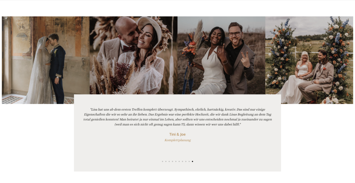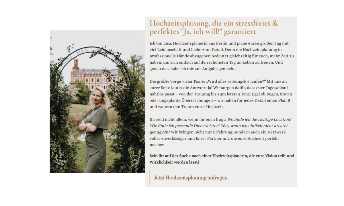 Das Bildmaterial und die verwendeten Designelemente sind authentisch sowie professionell eingebunden und passen hervorragend zum exklusiven Anspruch der Marke. Das Feedback- und Kontaktangebot wirkt ansprechend und lädt zur Kontaktaufnahme ein. Die Seite transportiert Kompetenz sowie Herzlichkeit und trifft genau die Zielgruppe anspruchsvoller Hochzeitspaare.