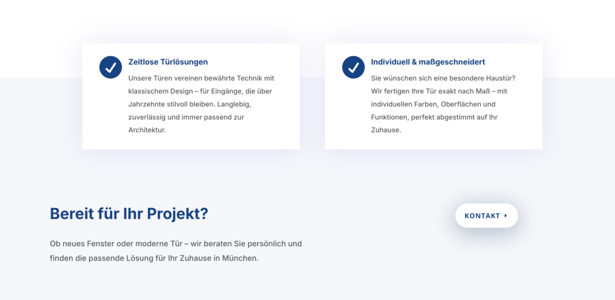 Besonders hervorzuheben ist die intuitive Navigation: Besucher finden sich dank der logisch aufgebauten Menüstruktur schnell zurecht. Alle relevanten Themen – von den angebotenen Produkten über Beratung und Service bis zu Kontaktmöglichkeiten – sind nur einen Klick entfernt. Die stimmige Bildsprache, inklusive echter Team- und Referenzfotos, schafft Transparenz und Vertrauen. Große, gut sichtbare Call-to-Action-Buttons wie „Unverbindliches Angebot anfordern“ fördern eine starke Nutzerinteraktion.