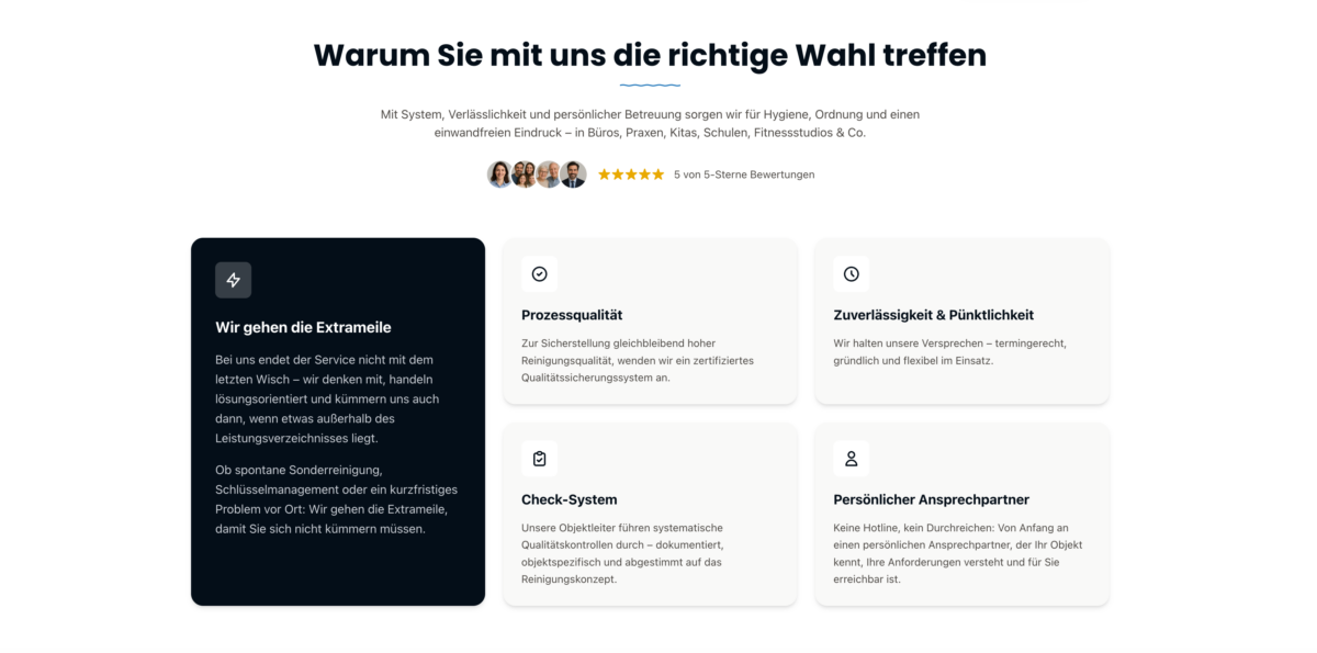 Besonders hervorzuheben ist die ausgezeichnete Performance in puncto SEO und Zugänglichkeit: Die Texte sind suchmaschinenoptimiert gestaltet, überschriftenbasiert strukturiert und auch auf mobilen Endgeräten top lesbar. Wichtige Gütesiegel, Kundenbewertungen und Referenzen werden gezielt eingesetzt, um Seriosität und Kompetenz nach außen zu transportieren. Die Einbindung eines flotten Cookie-Banners und eine zugängliche Navigation tragen ihr Übriges zu einem überzeugenden Gesamteindruck bei. Nicht nur für Kunden, sondern auch für Laien wird transparent, welche Vorteile und Lösungen bereitgestellt werden – ein echter Mehrwert für Interessenten im Marktumfeld von Gebäudedienstleistungen.