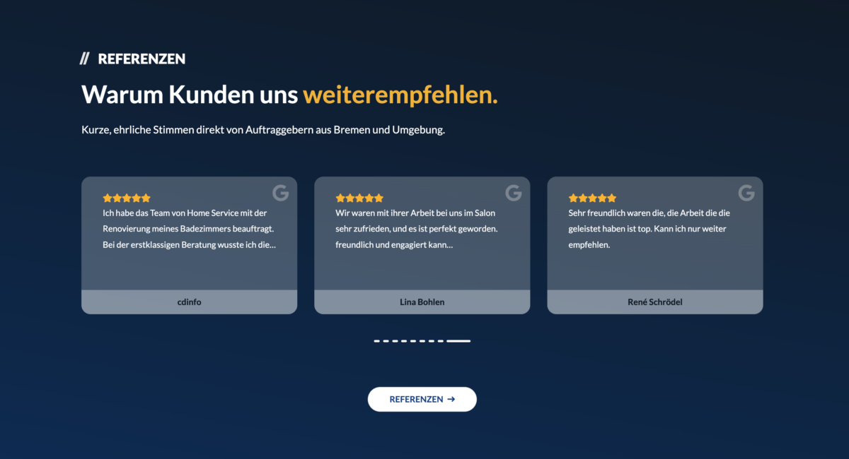 Die Website von Home Service Bremen präsentiert sich auf den ersten Blick äußerst professionell, klar und benutzerfreundlich. Bereits in der Hauptnavigation werden alle relevanten Menüpunkte wie Leistungen, Galerie, Referenzen und Kontakt übersichtlich angeboten. Besonders positiv fällt das stimmige Farbkonzept mit Blau- und Gelbtönen auf, das einen modernen und seriösen ersten Eindruck hinterlässt. Die große, lokal wirkende Header-Grafik mit echten Teammitgliedern sorgt für Authentizität und Vertrauen.