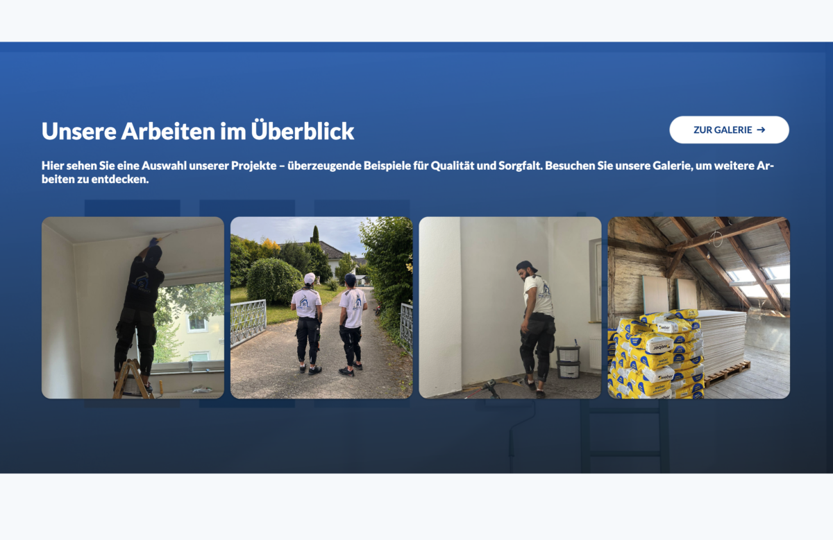 Die Struktur ist durchdacht, die Seiten sind logisch aufgebaut: Die Leistungsübersicht zeigt alle Services komprimiert und verständlich, ohne Besucher zu überfordern. Auch technisch bleibt die Seite überzeugend – das responsive Design stellt sicher, dass Inhalte auf mobilen Geräten wie Smartphones stets gut lesbar sind. Die Wahl einer klaren, großen Typografie verbessert die Barrierefreiheit und trägt zur hohen Lesbarkeit bei. Dank der zahlreichen, echt wirkenden Fotografien erhält der Nutzer einen authentischen Einblick in die Arbeitsweise des Handwerksbetriebs. Die Navigation bleibt konsistent und angenehm in der Führung, was eine hohe Nutzerfreundlichkeit sicherstellt.