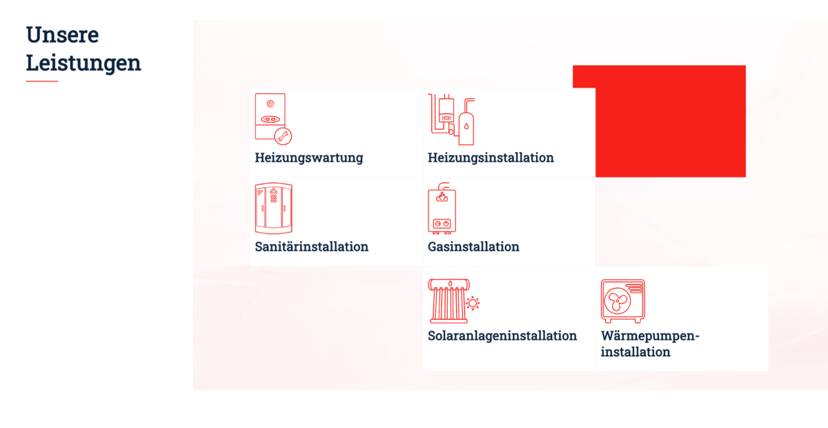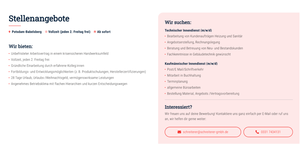 Die Website der Schreiterer Heizungs-Service und Sanitär GmbH überzeugt mit einer modernen, klaren Gestaltung und einer sehr gut strukturierten Nutzerführung. Besonders hervorzuheben ist die Kombination aus starken visuellen Elementen und einer angenehmen Lesbarkeit: Die Hauptfarben Rot und Weiß sorgen für ein einprägsames, professionelles Erscheinungsbild, das durch hochwertige Bildsprache und gezielte Akzente zudem das Corporate Design unterstreicht. Bereits auf der Startseite werden die Kernleistungen verständlich und auf den Punkt dargestellt – inklusive direkter Handlungsaufforderungen, die den Kontakt oder eine Bewerbung besonders einfach machen.