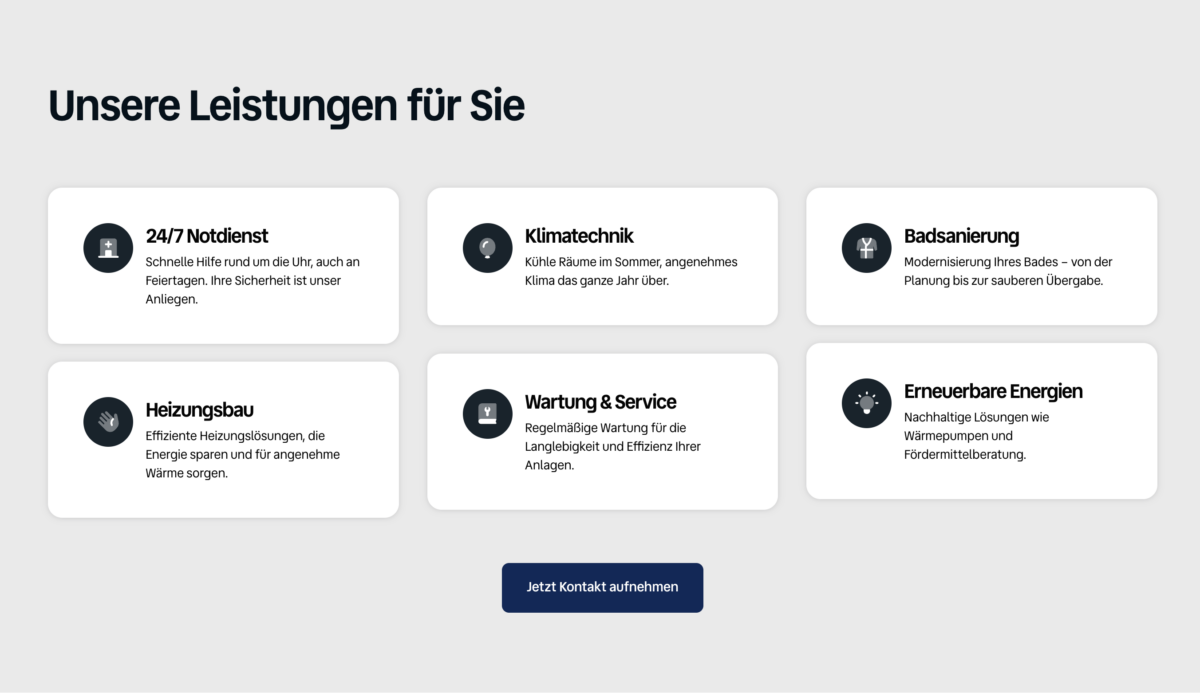 Hervorzuheben ist zudem die klare Positionierung des Unternehmens und die verständliche Kommunikation der Alleinstellungsmerkmale: Notfalldienst, Familienbetrieb und langjährige Erfahrung werden prägnant und sympathisch transportiert. Auch die Einbindung von echten Teamfotos wirkt authentisch und kundenorientiert. Besonders positiv fällt auf, dass die Kontaktaufnahme jederzeit durch prominente Buttons möglich ist. Die Seitenstruktur beugt Informationsüberflutung vor und platziert relevante Inhalte und Call-to-Actions sinnvoll. Kleinere Verbesserungen könnten das Farbschema und die Weißraum-Balance betreffen, um dem modernen Look noch mehr Frische zu verleihen. Insgesamt überzeugt die Webseite mit einem sehr starken Eindruck im SHK-Umfeld und erhält eine Bewertung von 90 Punkten.