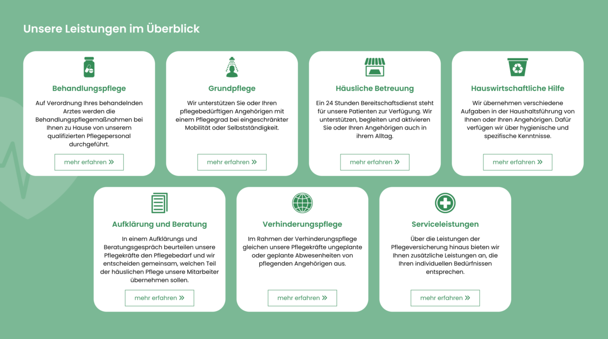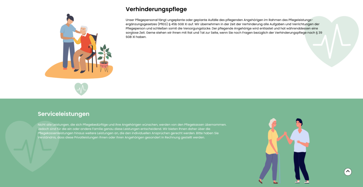Etwas Potenzial besteht noch in einer stärkeren Modernisierung der Gesamtstruktur, z.B. durch dynamischere Elemente oder eine visuell noch klarere Gliederung von Kern- und Zusatzleistungen. Insgesamt bleibt die Website aber ein sehr gelungenes Beispiel für professionelle, barrierearme und serviceorientierte Online-Kommunikation im Pflegesektor.