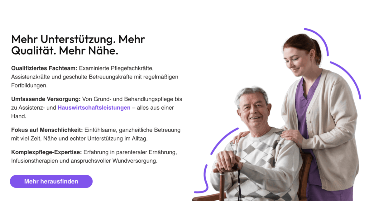 Ein besonderes Plus: Durchdachte Navigationsstrukturen und übersichtliche Menüs führen Kunden und Interessenten zielgerichtet zu den wichtigsten Informationen rund um Pflegeleistungen, Karrieremöglichkeiten und Kontaktaufnahme. Call-to-Action-Elemente sind sinnvoll platziert, die Ansprache ist einladend und barrierearm gehalten. Auch die semantische Auszeichnung im Quellcode – insbesondere Überschriftenstrukturen und ARIA-Labels – unterstützen dabei, die Zugänglichkeit weiter zu fördern.