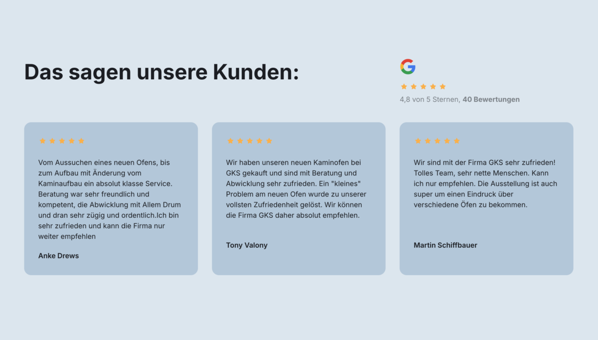 Der Einsatz authentischer Bilder aus echten Projekten schafft Nähe und Transparenz. GKS gibt mit Erfahrungswerten wie „50+ Jahre Schornsteinbau“, 10 zertifizierten Experten und über 250 Kaminen vor Ort ein starkes Signal für Kompetenz und Zuverlässigkeit – unterstützt von echten Kundenbewertungen, die für zusätzliches Vertrauen sorgen. Alle wesentlichen Informationen sind ohne große Umwege erreichbar, die zentral platzierten Call-to-Action-Buttons („Jetzt Kontaktieren“, „Zum Kaminofen Finder“) erleichtern die nächste Aktion und motivieren zur Kontaktaufnahme. Professionelle Partnerlogos stärken das Bild als etabliertes und breit vernetztes Unternehmen.