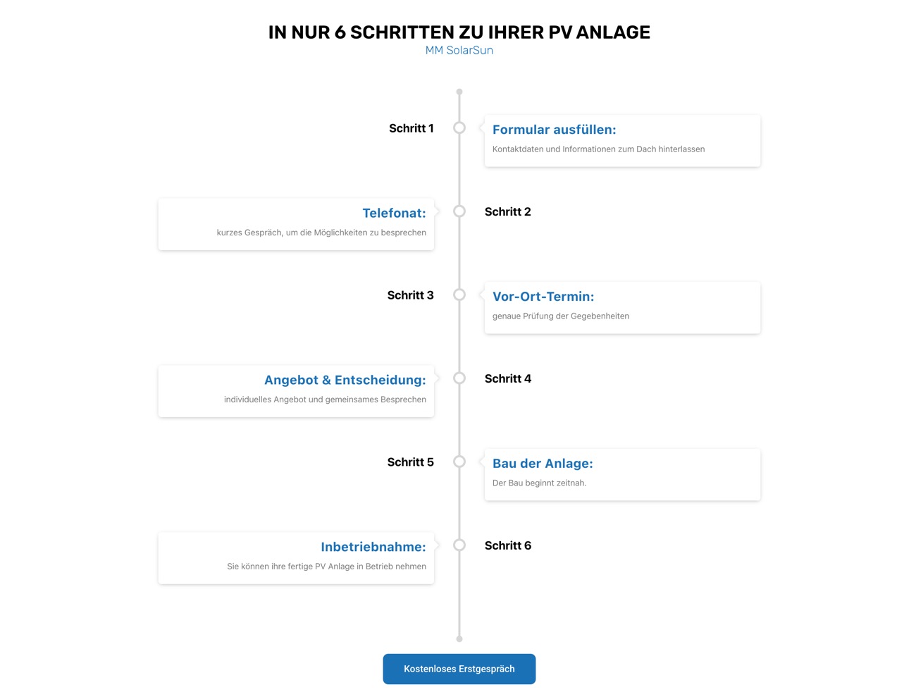 Die Navigation ist übersichtlich gehalten mit den Hauptpunkten Home, Projekte, Karriere, Kontakt – so findet ein Besucher rasch, was er sucht. Die klare Schritt‑für‑Schritt Darstellung („In nur 6 Schritten zu Ihrer PV Anlage“) schafft Vertrauen und zeigt den Prozess transparent auf.