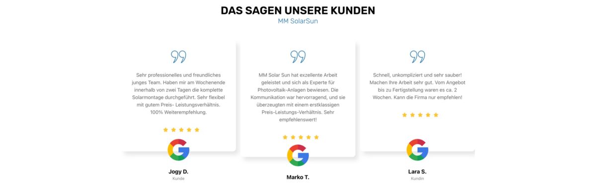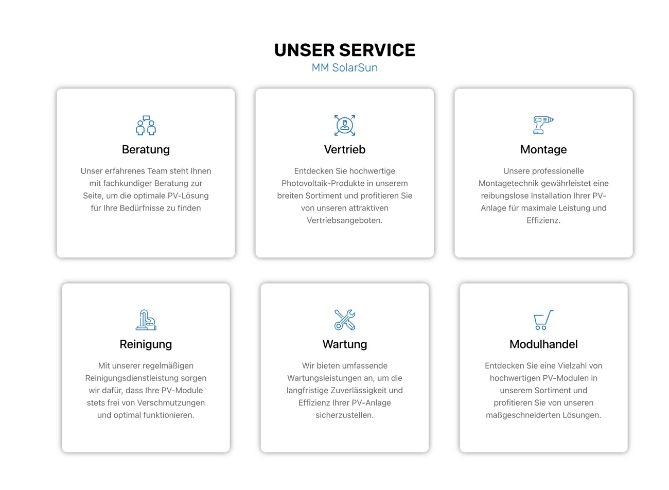 Aus Sicht der Zielgruppe (Privatkunden bzw. kleinere Gewerbe–Photovoltaik) sind die Leistungen rund um Beratung, Montage, Reinigung und Wartung verständlich dargestellt – das schafft Mehrwert und Nutzerorientierung.