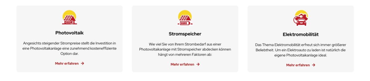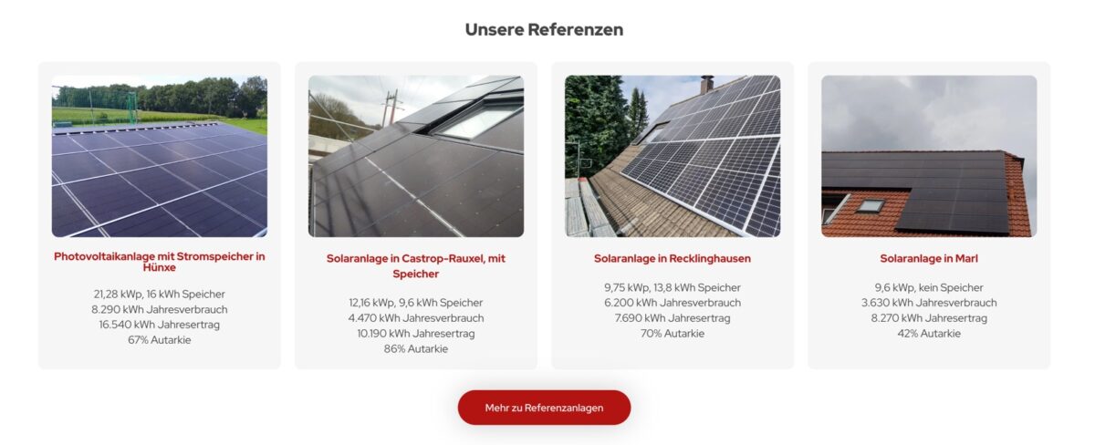 Technisch ist die Seite auf einem hohen Niveau: Sie lädt schnell, ist responsiv und optisch modern umgesetzt. SEO-seitig ist die Grundstruktur vorhanden, könnte aber durch mehr inhaltliche Tiefe – etwa Blogbeiträge zu Stromspeichern, Förderungen oder Tipps zur Eigenstromnutzung – ausgebaut werden.