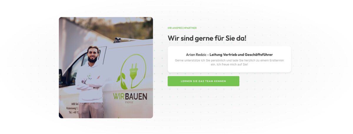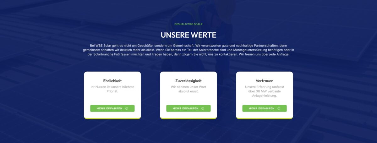 Unterhalb des Einstiegs werden die Leistungsbereiche „PV für das Dach“ und „PV für Freiflächen“ vorgestellt – ein klares Signal, dass sowohl private als auch gewerbliche Projekte abgedeckt werden. Im Abschnitt „Wer sind wir?“ beschreibt WBE Solar seine Identität als Familienbetrieb mit Spezialisierung auf Montagearbeiten, bundesweiter Flexibilität und deutschem Fachpersonal, was eine reibungslose Kommunikation auf Baustellen gewährleistet.
