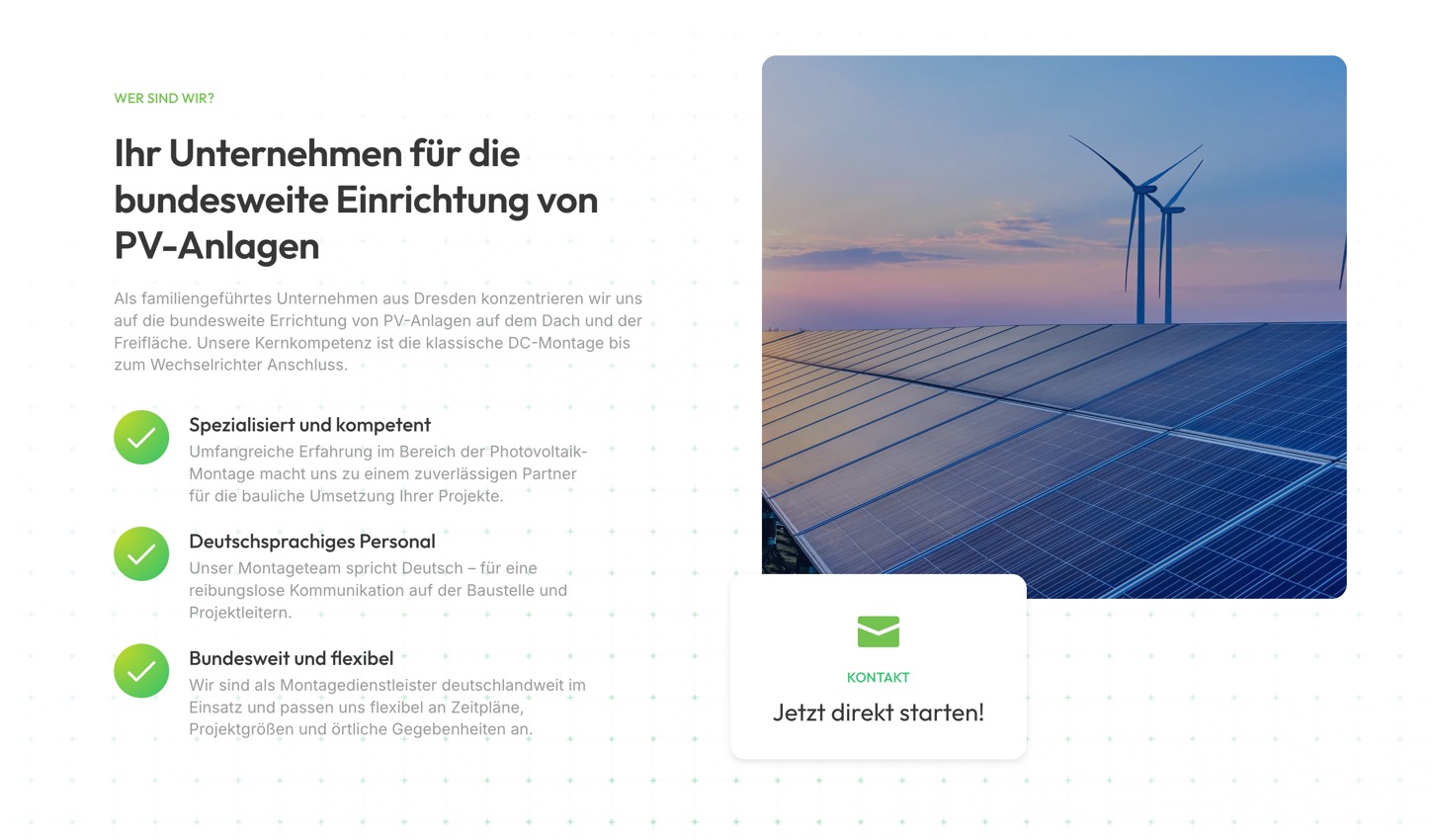 Insgesamt bietet die Website einen fokussierten, authentischen und professionellen Auftritt, der die Montagekompetenz von WBE Solar klar herausstellt – übersichtlich, vertrauenswürdig und auf das Wesentliche reduziert.