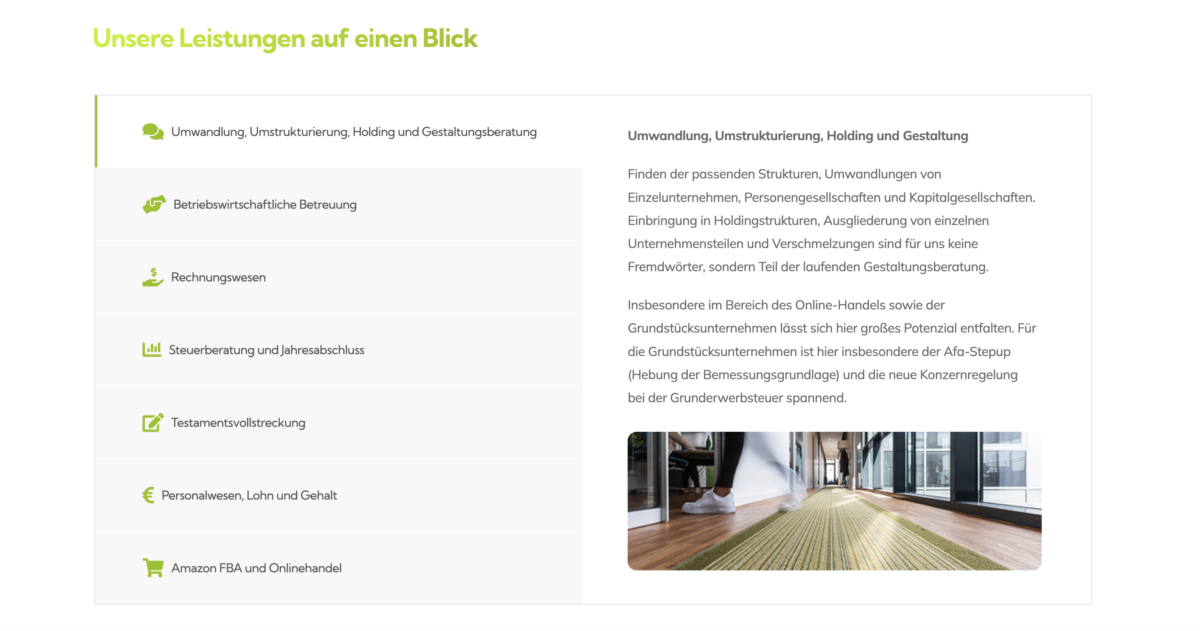 - Strukturierte Inhalte mit klaren Leistungsbeschreibungen