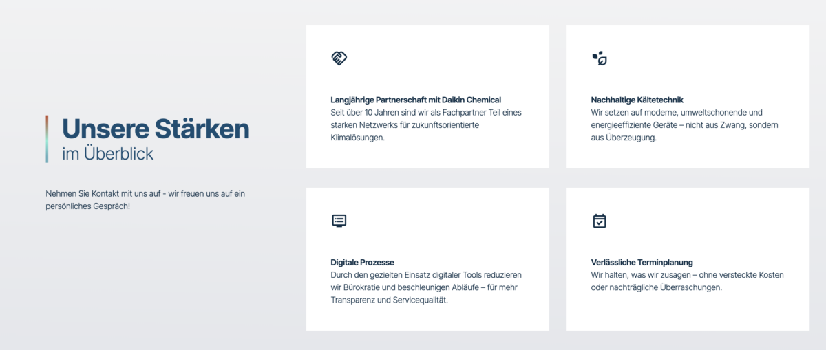 Hinsichtlich SEO und technischer Standards liefert die Webseite starke Ergebnisse. Der Code ist sauber und semantisch korrekt strukturiert, was sowohl die Auffindbarkeit durch Suchmaschinen als auch die Barrierefreiheit unterstützt. Zudem wird relevante Branchenterminologie konsequent eingesetzt – ein Pluspunkt für die Sichtbarkeit im Netz. Die Website ist mobil optimiert, lädt zügig und reagiert flexibel auf verschiedene Displaygrößen, was die Nutzererfahrung weiter verbessert. Besonders hervorzuheben ist außerdem die klare Gliederung der Leistungen, die es Besuchern leicht macht, die angebotenen Services zu überblicken und eine unverbindliche Beratung anzufordern. Insgesamt präsentiert sich KS Klima-Service digital auf höchstem Niveau und ist damit eine Empfehlung für Fachbetriebe, die ihren Online-Auftritt modernisieren möchten.