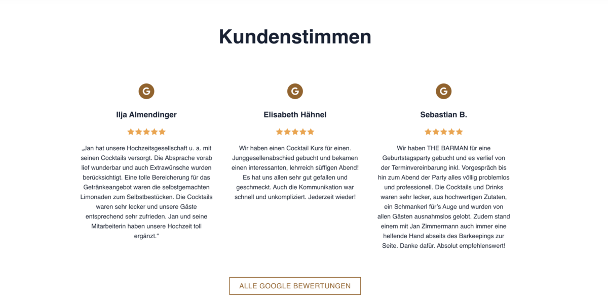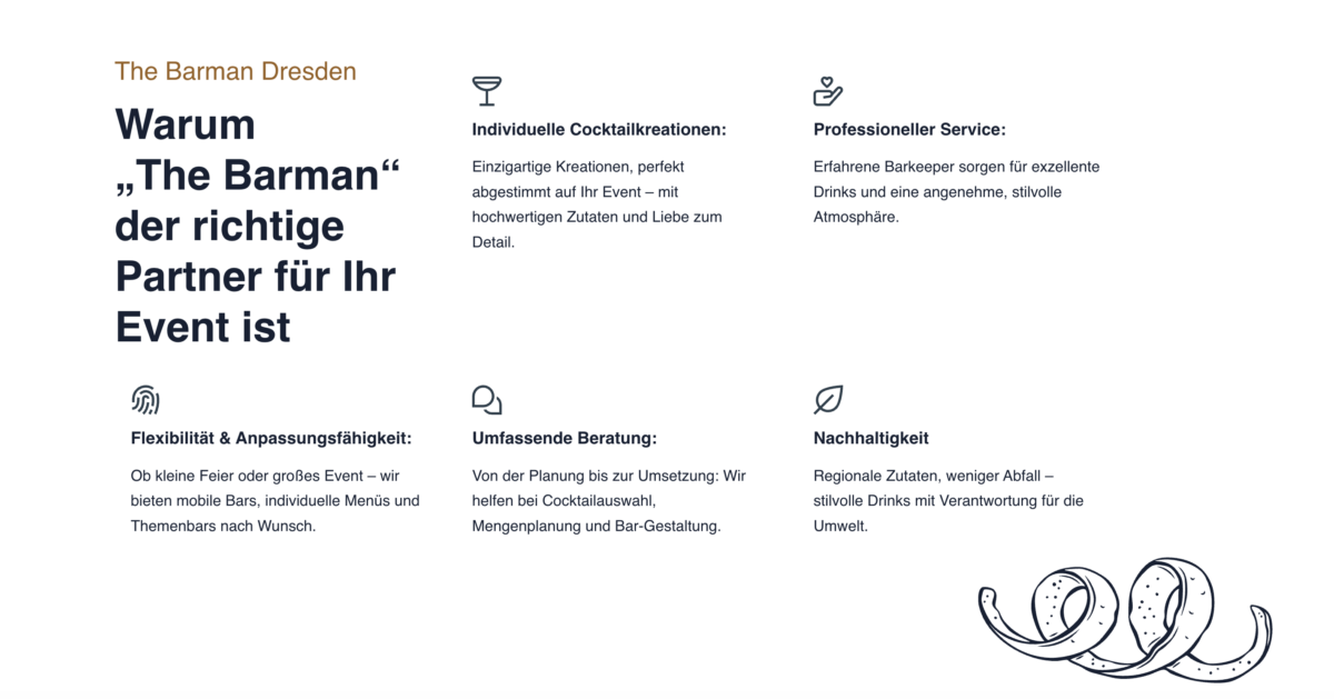 Die Website von The Barman Dresden präsentiert sich als ideales Beispiel für gelungenes Webdesign im Bereich Cocktail Catering. Vom ersten Moment an fällt die klare Struktur und das ansprechende, professionelle Erscheinungsbild ins Auge. Die Navigation ist logisch aufgebaut, und die wichtigsten Informationen sind schnell erfassbar – sei es zu den Leistungen, Kundenstimmen oder zum Kontakt. Besonders benutzerfreundlich zeigt sich die Seite durch eine konsistente Farbwelt, großen, gut lesbaren Schrifttypen und einen einladenden Call-to-Action-Button, der prominent platziert sofort ins Auge fällt.