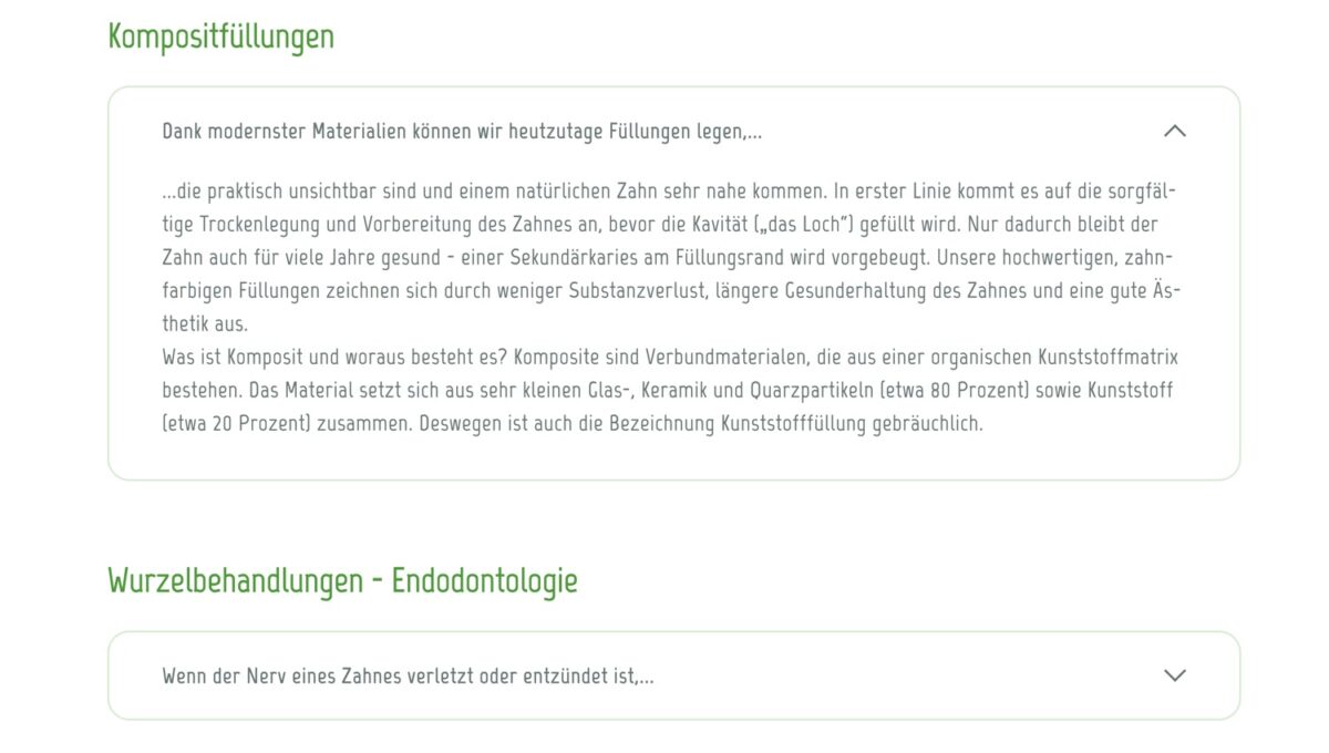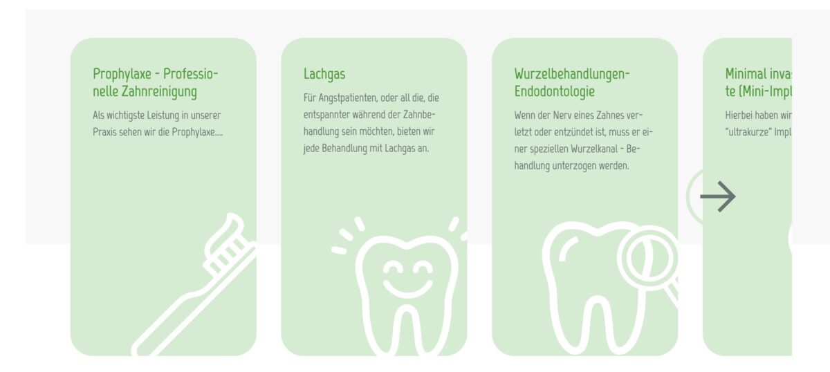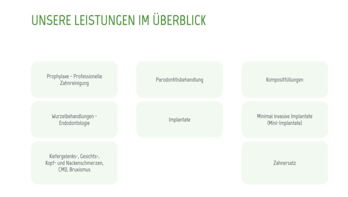 Im Leistungsbereich werden gängige und spezialisierte Behandlungen wie Prophylaxe, Lachgas für Angstpatienten, Implantate, Aligner-Therapie oder Wurzelkanalbehandlungen übersichtlich erklärt. Das schafft Transparenz darüber, was Patienten erwarten können.
