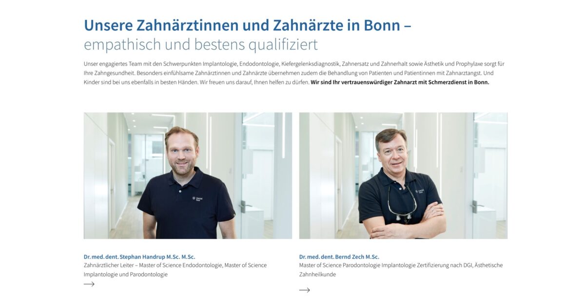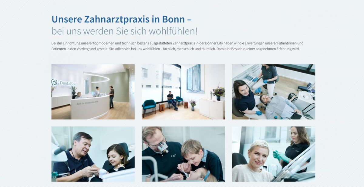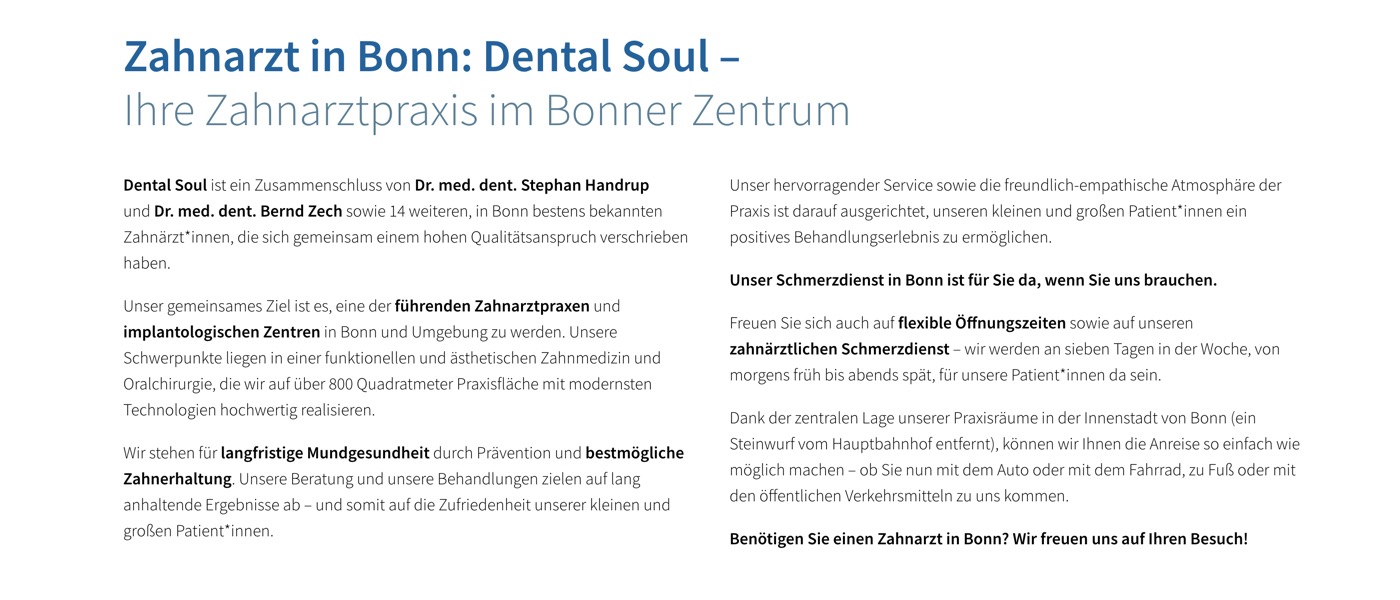 Dental Soul in Bonn präsentiert sich als moderne, mehrfach besetzte Zahnarztpraxis mit großem Leistungsumfang, hochwertiger Ausstattung und starkem Servicefokus. Schon auf der Startseite werden zentrale Stärken hervorgehoben: 14 Zahnärztinnen und Zahnärzte, modernste Technologien, über 800 m² Praxisfläche und eine zentrale Lage in Bonn. Ein klar platzierter Button „Termin vereinbaren“ im Header sorgt für eine intuitive Nutzerführung und erleichtert den direkten Kontakt.