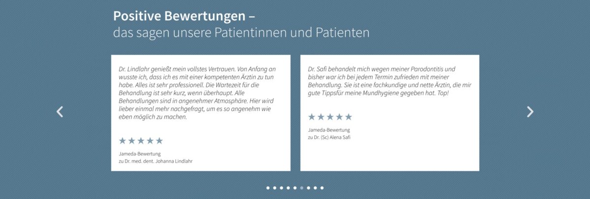 Das Team wird ausführlich vorgestellt, inklusive Spezialisierungen und beruflicher Werdegänge. Eingebundene Patientenbewertungen, etwa über Jameda, schaffen zusätzlich Vertrauen. Auch die Kontaktmöglichkeiten sind nutzerfreundlich gestaltet: Online-Terminbuchung, Telefonnummer, Adresse und sogar ein digitaler Anamnesebogen für Neupatienten sind leicht zugänglich.