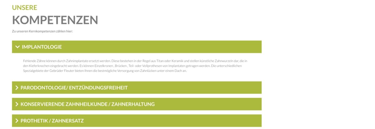Die Menüstruktur ist klar und intuitiv: „Über uns“, „Kompetenzen“, „Kontakt“, „Glossar“ etc. Das Glossar ist ein gutes Angebot für Patienten, die medizinische Begriffe verstehen wollen – das hebt die Website aus dem einfachen Werbeauftritt heraus. Die Seite führt kompetente Teamprofile: die Brüder Dr. Christian Fleuter (Zahnmedizin / Implantologie) und Dr. Martin Fleuter (Oralchirurgie) werden namentlich mit ihrem Werdegang vorgestellt.