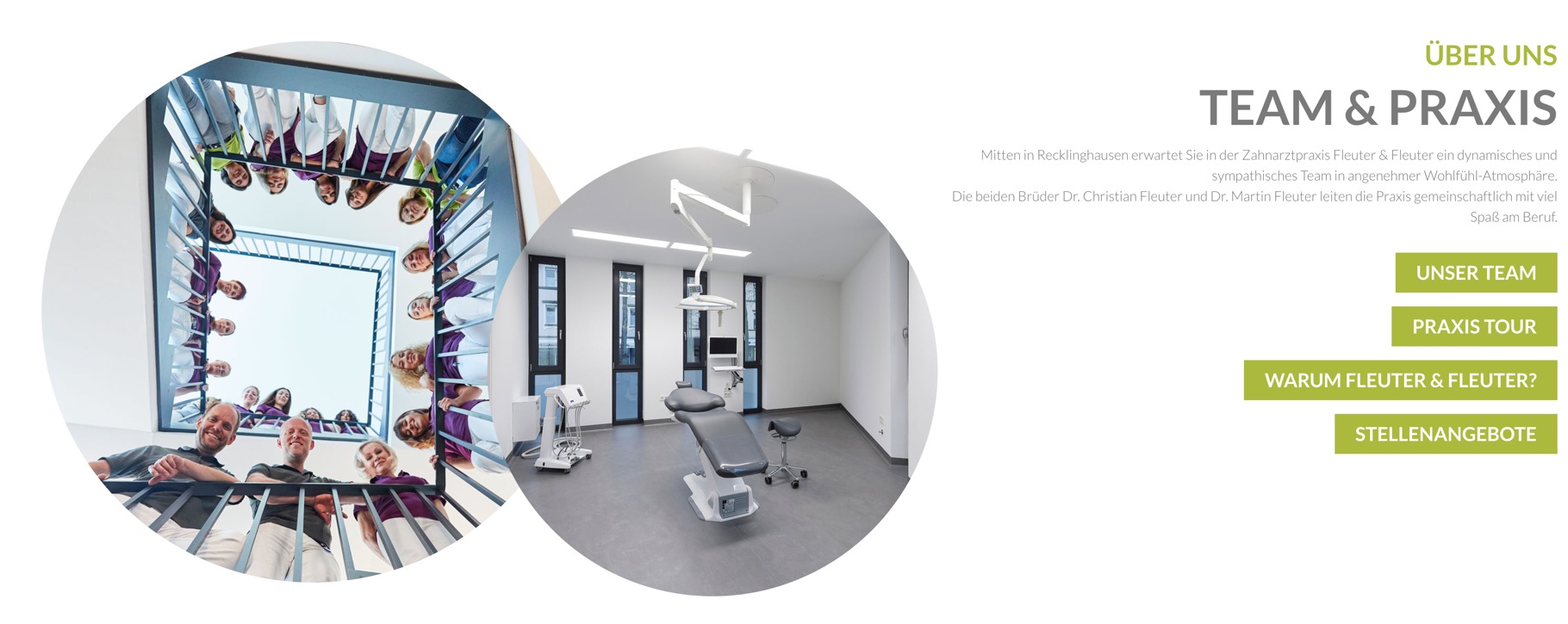 Die Website von Fleuter & Fleuter aus Recklinghausen zeigt sich als durchdachte, seriöse Praxispräsenz, die Zahnmedizin, Oralchirurgie und ein praxeigenes Labor unter einem Dach vereint. Auf der Startseite ist schnell erkennbar, dass hier Erfahrung und Modernität Hand in Hand gehen: „seit über 40 Jahren“ wird genannt, und es wird explizit auf moderne Behandlungstechniken wie CEREC hingewiesen.