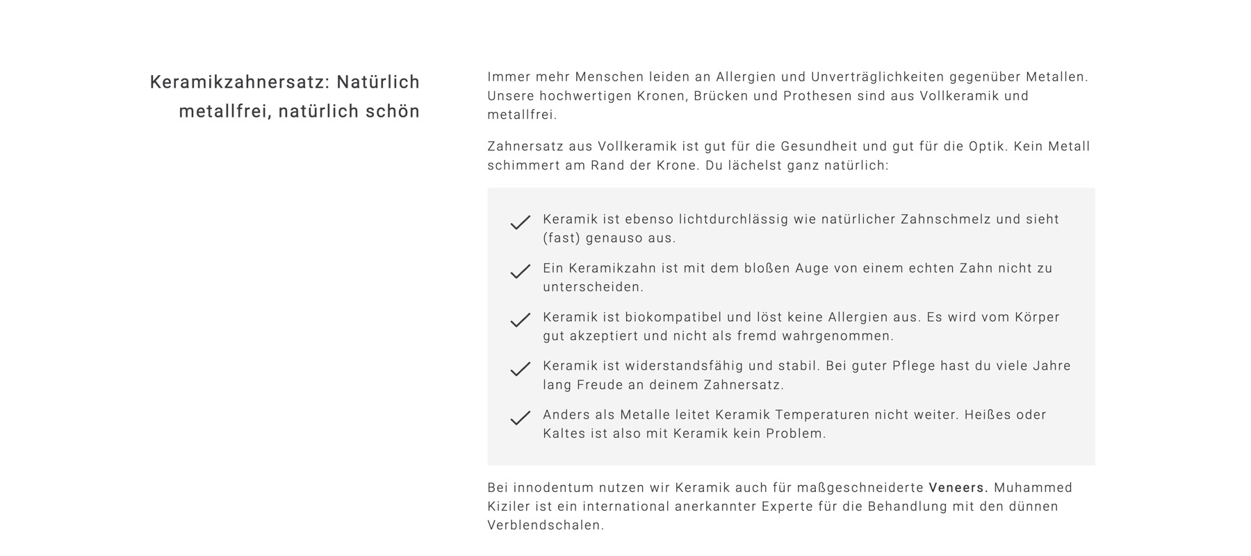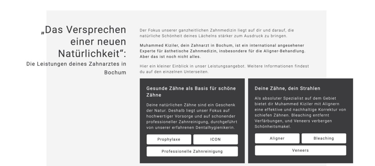 - Starke Spezialisierung auf Ästhetik + Zahnästhetik & Zahnersatz (Aligner, Veneers etc.)