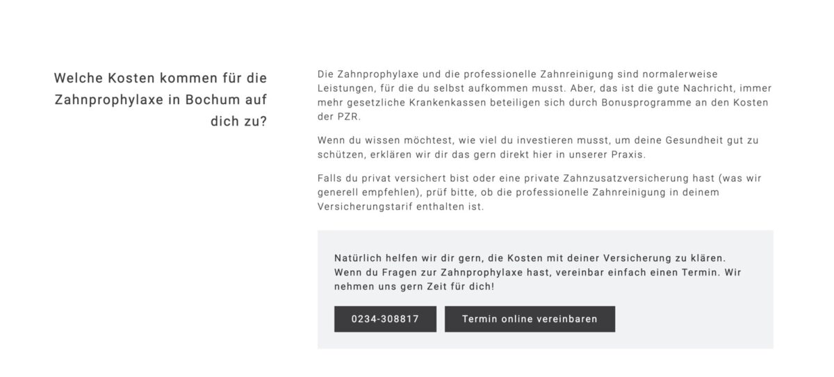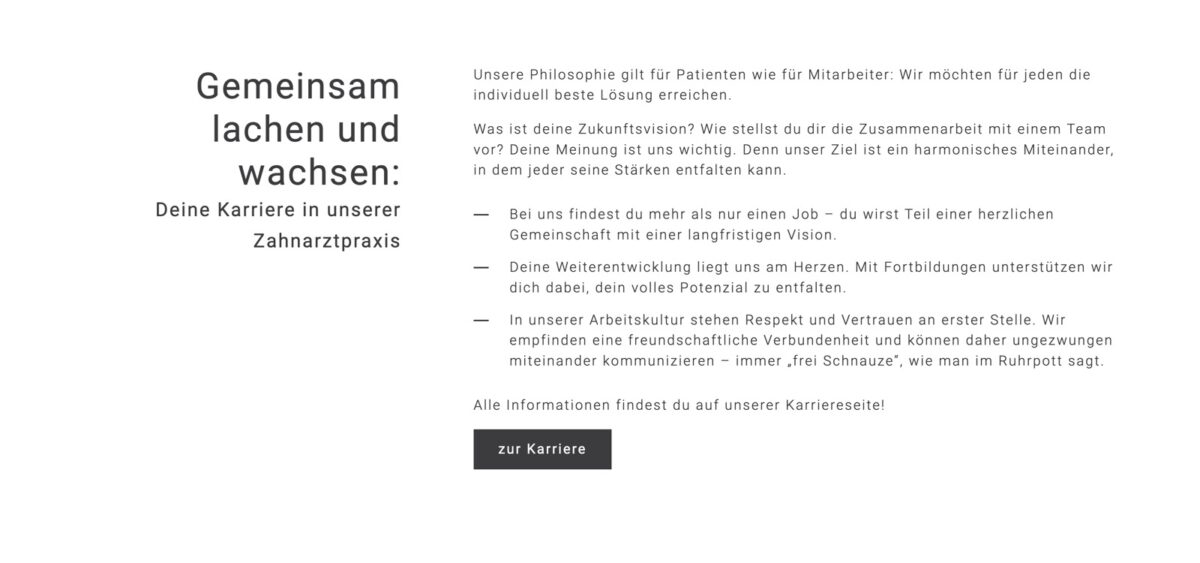 Die Spezialisierung auf Ästhetik und schonende Verfahren ist klar kommuniziert. Mehr noch: Prophylaxe, Parodontologie, Wurzelbehandlung & professionelle Zahnreinigung sind ebenfalls Teil des Leistungsangebots – das zeigt, dass die Praxis auch auf Gesundheit & Zahnsubstanz achtet, nicht nur Kosmetik. Der Teamgedanke & Philosophie („vertrauen durch echtes Verständnis“, „zuhören“, „Fortbildungen“) wird betont, was die Seite menschlich und nahbar macht.