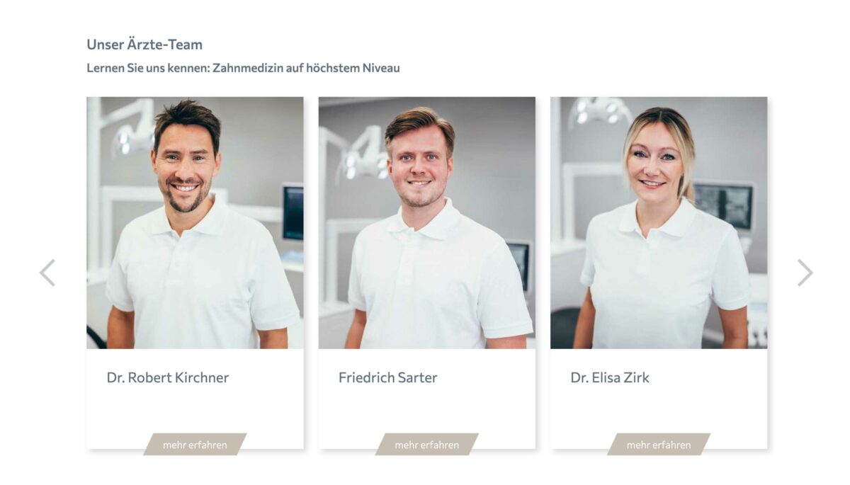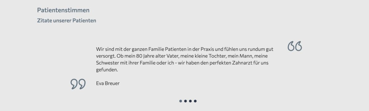 Ebenso positiv: die Patientenansprache wirkt emphatisch & persönlich. Texte wie „Für gesunde und strahlend schöne Zähne!“, „Herzlich willkommen … Ihre Zahngesundheit in den besten Händen“, „Ein multiprofessionelles Team … sorgt dafür, dass Sie … perfekt aufgehoben sind“ vermitteln Vertrauen. Dass viele Sprachen gesprochen werden (Deutsch, Englisch, Spanisch, Türkisch etc.) unterstreicht Offenheit & Patientenorientierung.