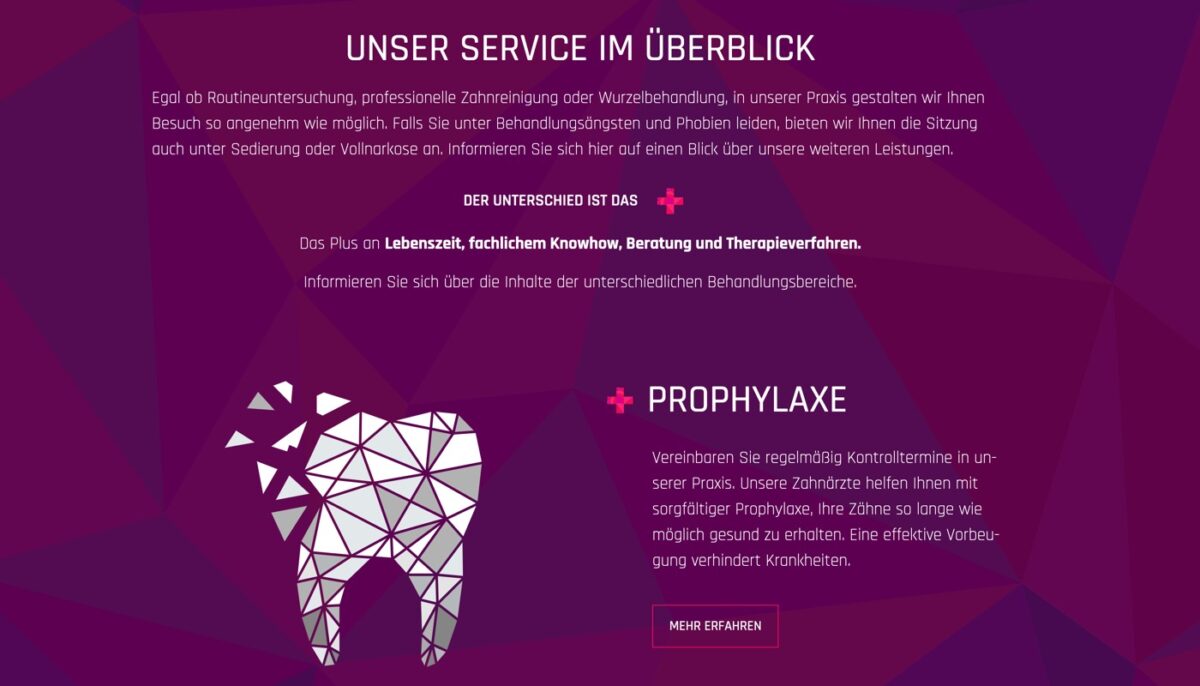 Unter „Leistungen“ werden alle relevanten zahnmedizinischen Bereiche aufgeführt: Prophylaxe, Zahnerhaltung, Parodontologie, Zahnersatz, Implantologie, Oralchirurgie, Wurzelkanalbehandlungen sowie ästhetische Zahnmedizin. Zusätzlich bietet die Praxis Services wie Schlafmedizin / Schnarcherschienen, eigenes Labor, LASER-Therapie, Eigenbluttherapie (PRF), digitale Verfahren und Sofortlösungen („Single Visit Dentistry“) an.