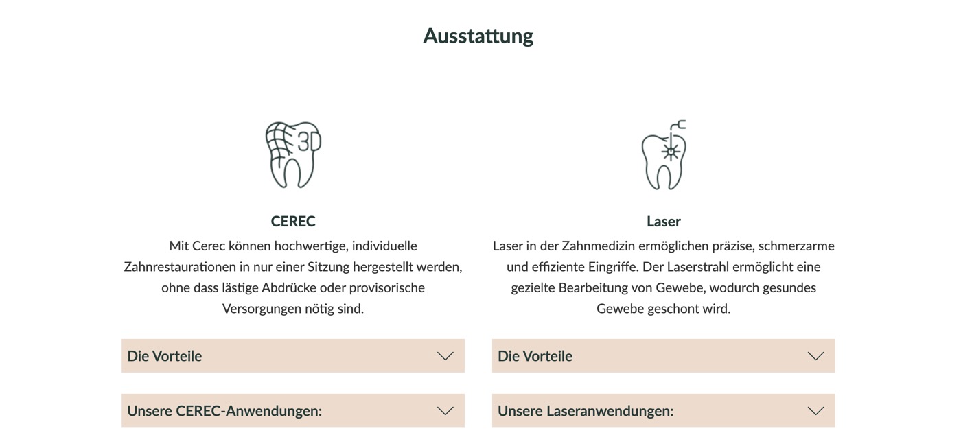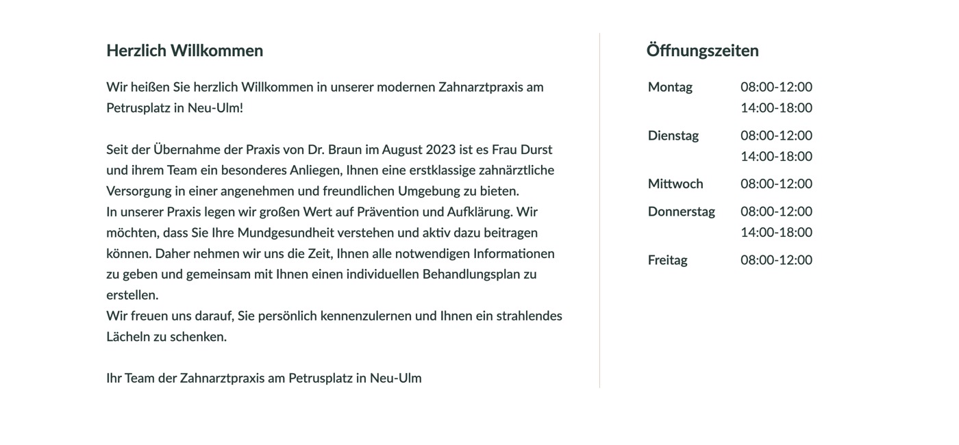 Die Website der Zahnarztpraxis Durst richtet sich gezielt an Patient:innen, die Wert auf moderne Zahnmedizin, individuelle Betreuung und eine freundliche Umgebung legen. Bereits im Willkommenstext wird deutlich, dass der Praxis Inhaberin viel daran liegt, Zeit für Beratung und Aufklärung einzuplanen und die Nutzerinnen nicht nur als Patient:innen, sondern als Menschen wahrzunehmen.