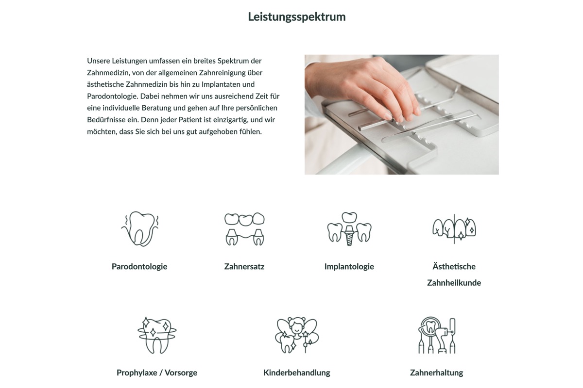 Die Leistungsübersicht zeigt ein breit gefächertes Angebot: von Prophylaxe über ästhetische Zahnheilkunde bis hin zu Implantologie und Zahnersatz mit modernen Verfahren wie CEREC. Diese Bandbreite spricht sowohl Routine‑Patient:innen als auch anspruchsvollere Fälle an.
