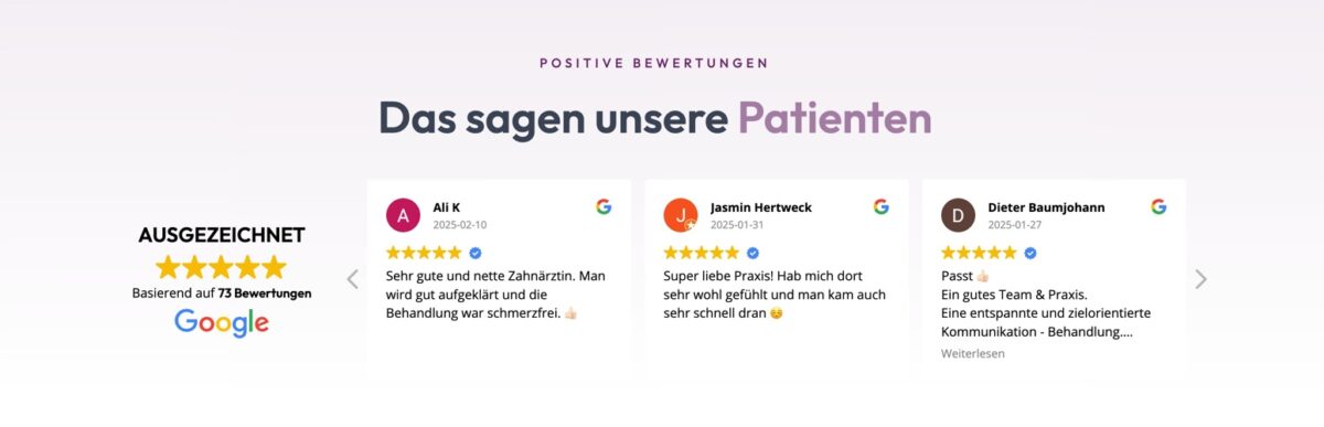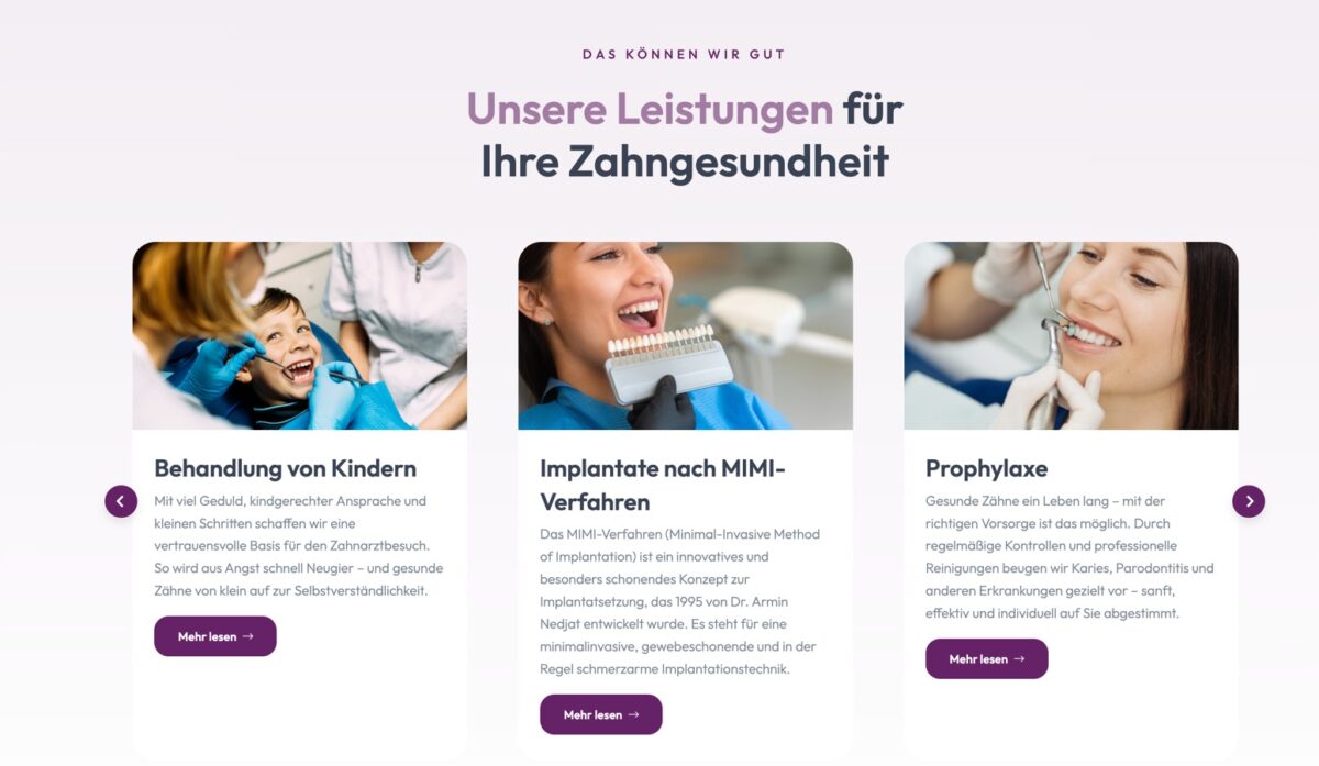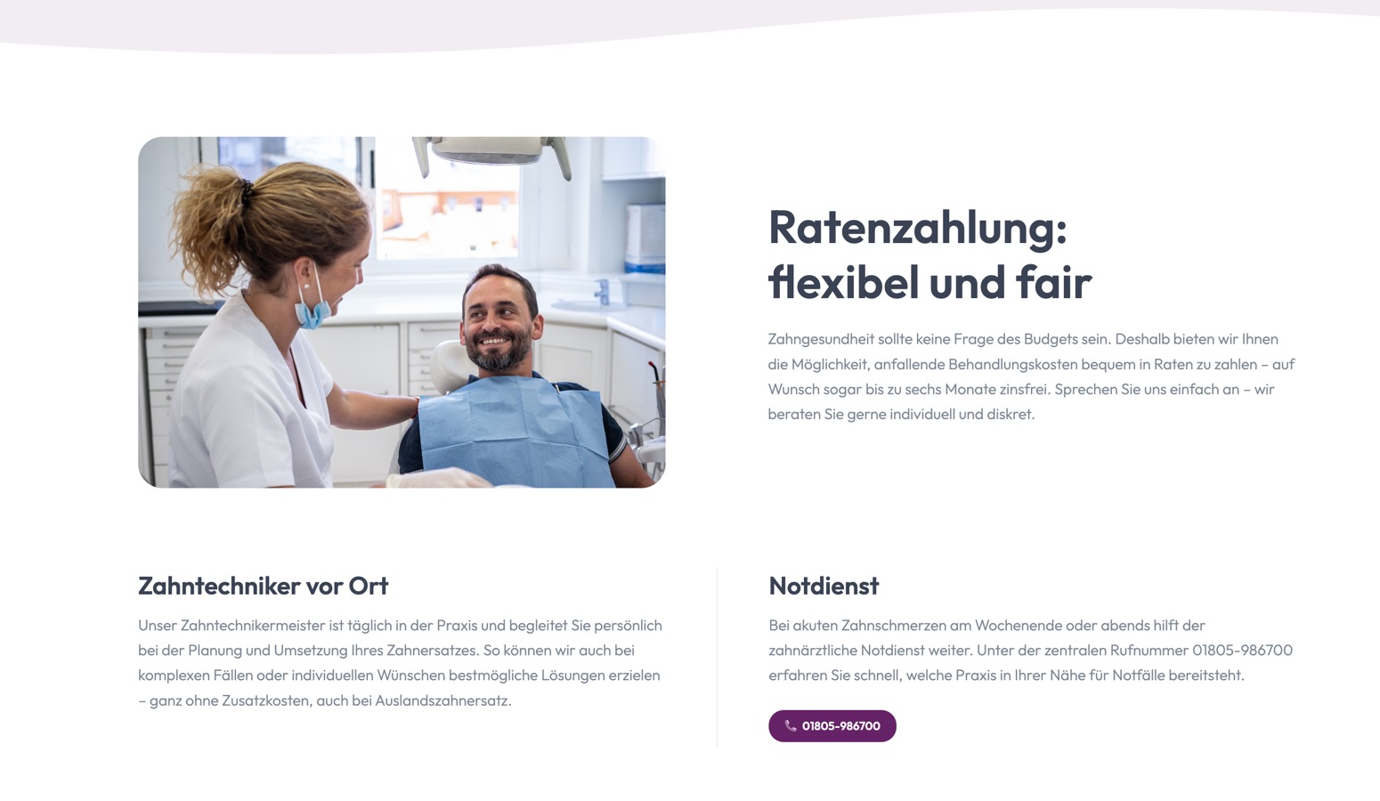 Technisch/SEO‑seitig stehen viele gute Grundlagen: Menüs wie Praxis, Leistungen, Service sind klar strukturiert; Inhalte sind verständlich geschrieben; besonderer Leistungsinhalt wie minimalinvasive Implantologie wird erklärt. Es ist außerdem sichtbar, dass Bonus‑Optionen (z. B. Ratenzahlung) angeboten werden.