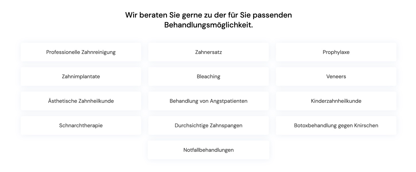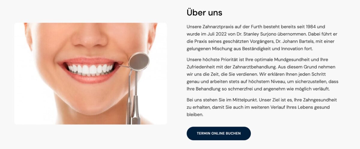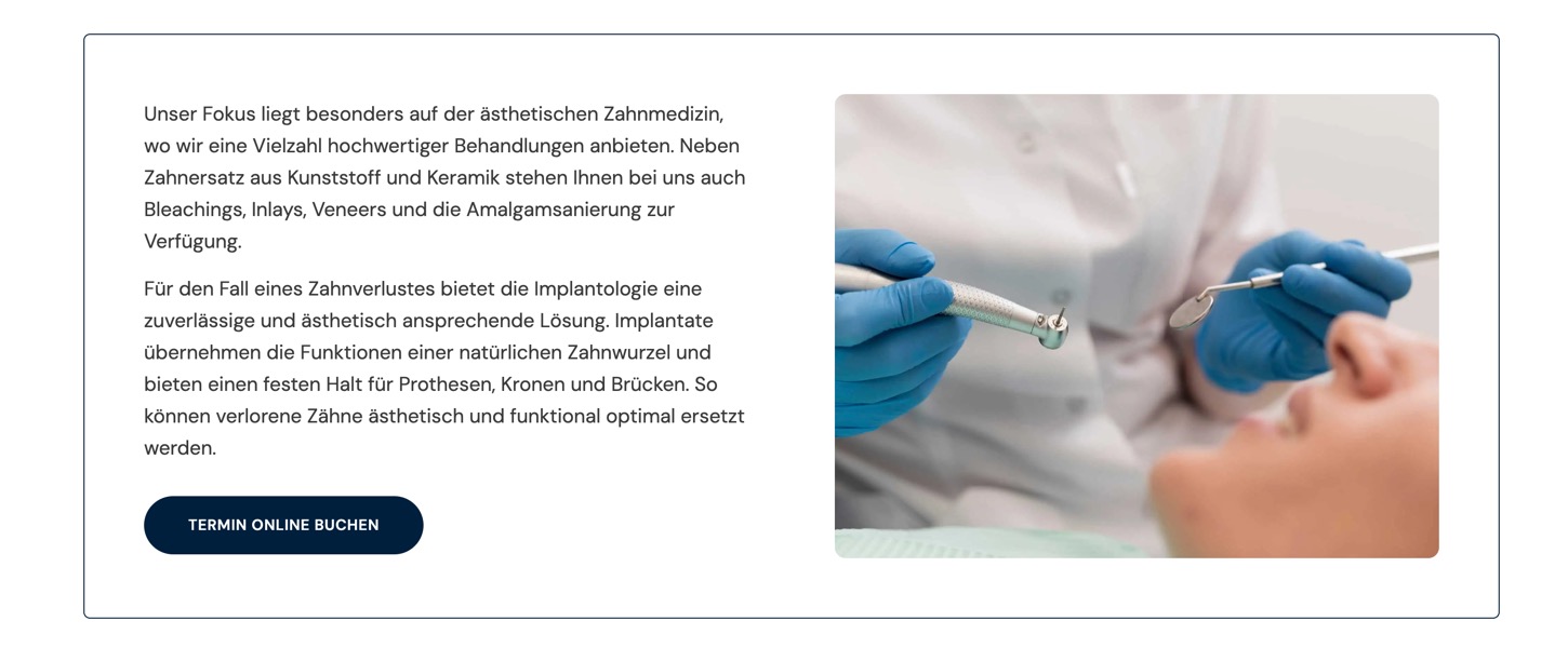 Das Leistungsportfolio wird präzise dargestellt – von Zahnerhalt über Implantologie bis zur Prophylaxe. Dabei gelingt es der Praxis, sowohl fachlich fundiert als auch zugänglich zu kommunizieren. Visuell bleibt die Seite eher sachlich, aber dennoch einladend. Hier könnte in Zukunft durch mehr Emotionen oder persönliche Einblicke (z. B. echte Patient:innenstimmen oder Bilder aus dem Alltag) noch zusätzlicher Mehrwert geschaffen werden.
