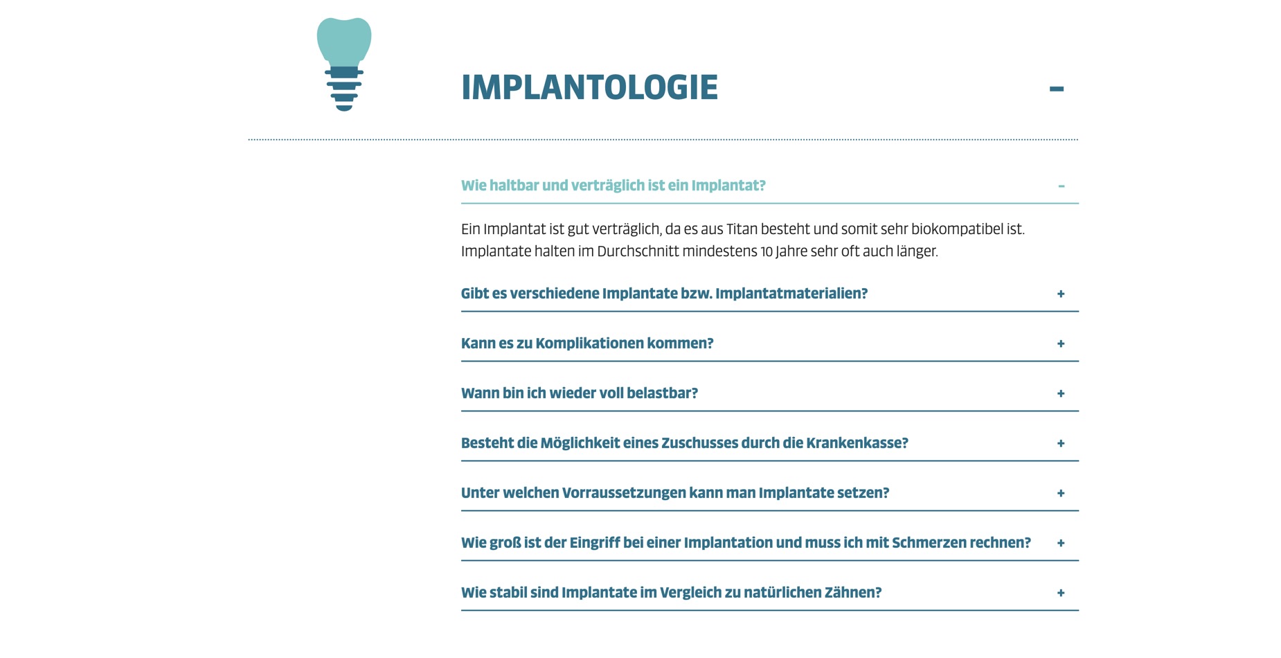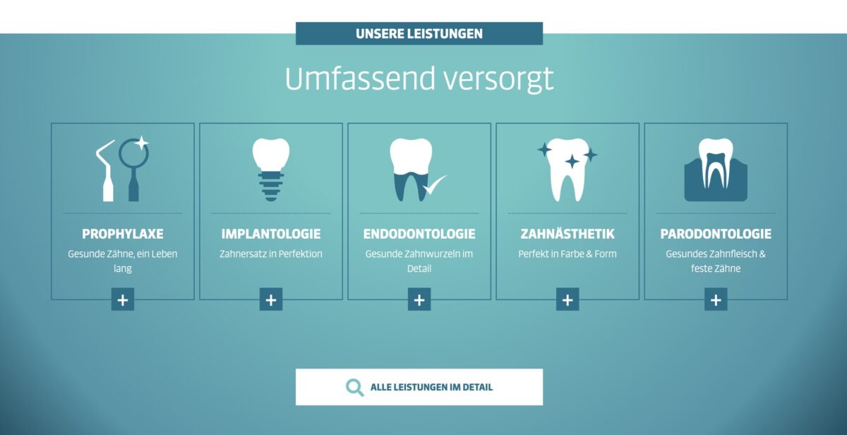 Für Patienten besonders hilfreich: Die Terminbuchung ist direkt verlinkt, FAQs sind prominent eingebunden („Ihre Fragen“), und es gibt gut strukturierte Leistungsseiten – von Prophylaxe bis Implantologie. Auch die Navigation überzeugt: logisch, übersichtlich, mobil gut erreichbar. Kontaktinformationen, Anfahrt und Öffnungszeiten sind klar platziert. Besonders lobenswert ist der Fokus auf Verständlichkeit – Fachliches wird in einfacher Sprache erklärt, ideal für eine breite Zielgruppe.